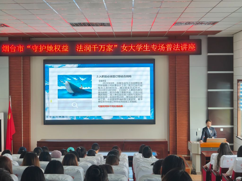 2025年5月15日,由烟台市妇联和烟台劳动人事争议调解仲裁院主办、学生工作处承办的“守护她权益,法润千万家”女大学生专场就业普法讲座在我校举行。烟台市劳动人事争议调解仲裁院调解仲裁二庭副庭长李华同志主讲。